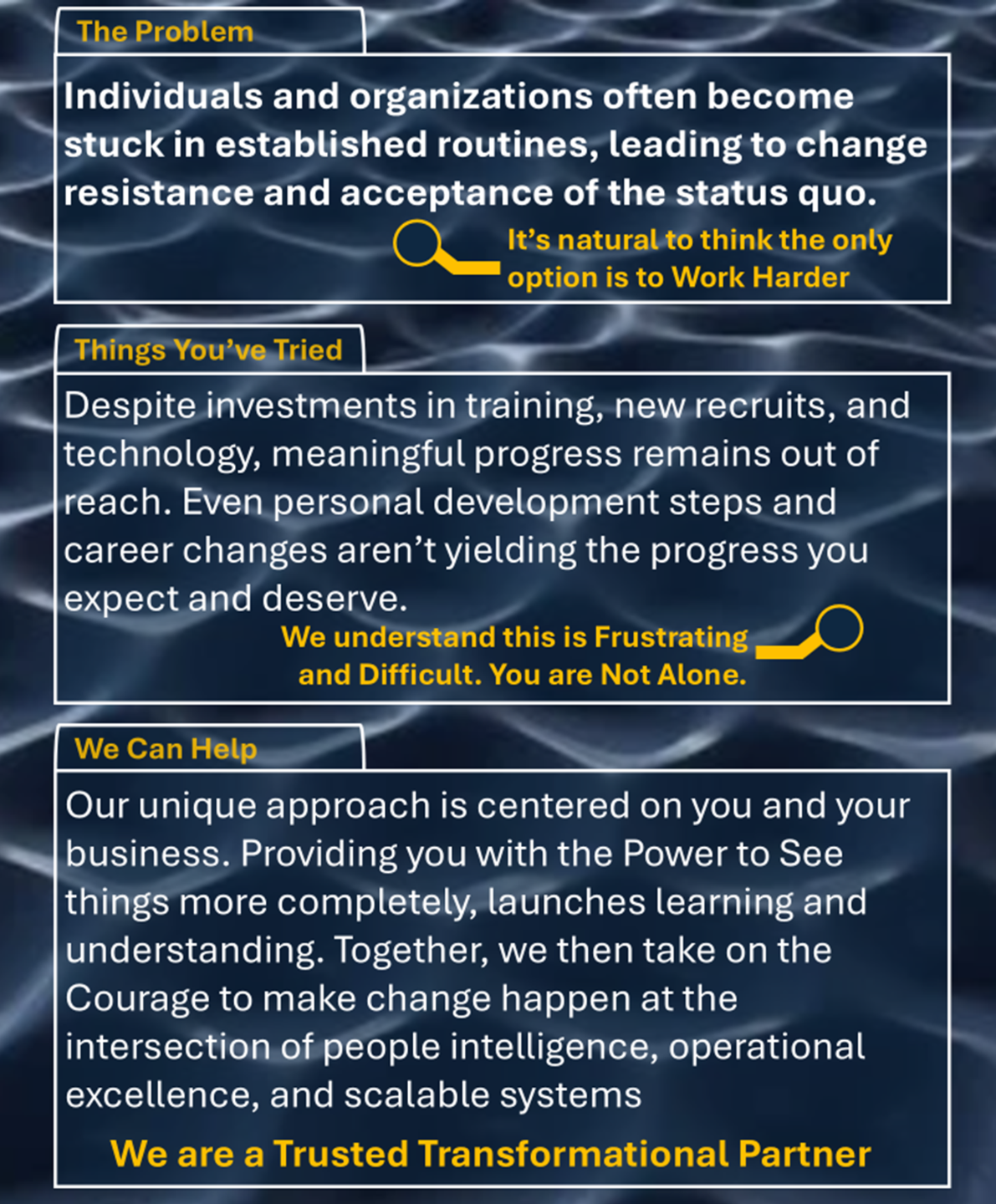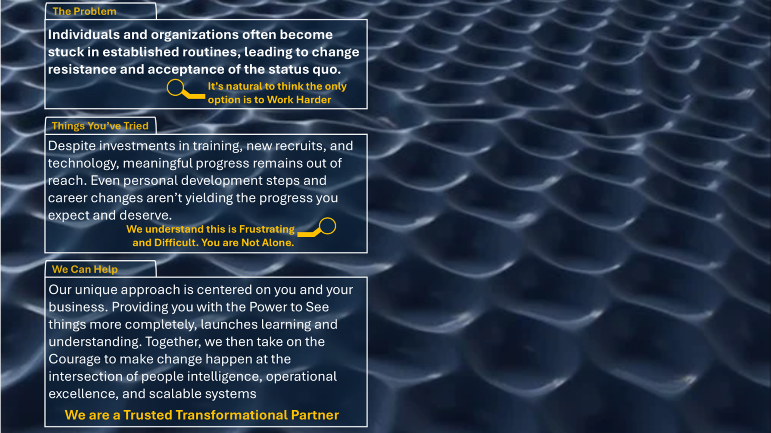 Despite investments in training, new recruits, and technology, meaningful progress remains out of reach. Even personal development steps and career changes aren’t yielding the progress you expect and deserve.